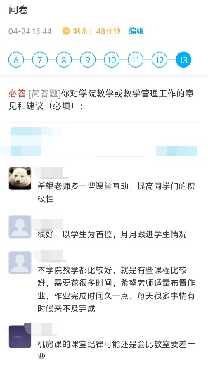 为了进一步规范日常教学行为,检查小组首先检查了教师的教学大纲执行情况、教学进度执行及变更情况、期中考试安排情况、课堂调停课情况、实验教学任务执行情况、学生教材持有率等,对发现的问题及时反馈,督促整改。另外,为更好了解学生学习中存在的问题和困难、教师师德师风、课堂育人、教学管理等情况。4月24日,计算机科学与技术系党支部书记程虹在N5-401会议室主持召开座谈会,副院长张其林、专业负责人马园园、班主任代表、各班学生代表参加座谈会。首先,程虹发布学情调查问卷,收集学生学习情况,以便有针对性地改进教学。