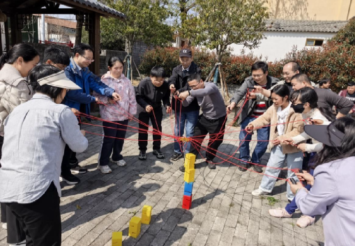 午后,精彩的团建活动正式拉开帷幕。一段活力四射的热身舞蹈瞬间点燃了现场的气氛,教职工们跟着节奏尽情舞动,释放着活力与激情。随后开展的“巧解绳结”则考验着团队的智慧与协作耐心,大家集思广益,密切配合,在反复尝试中探寻最优解法。在“吊绳搭积木”环节,大家分组合作,通过默契配合和科学策略,共同完成挑战,充分彰显了团队协作的强大力量。随后的模拟投掷手榴弹活动,更是将现场气氛推向高潮,教职工们在趣味体验中进一步增强了集体归属感,同时收获了满满的成就感。