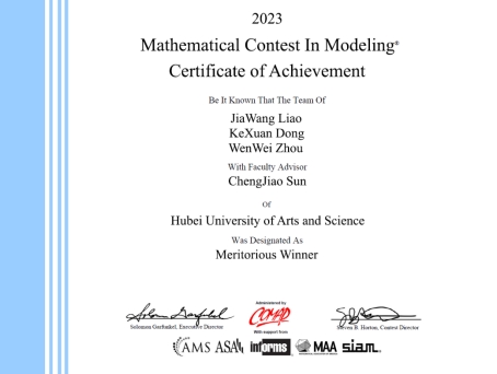 (英国威廉集团 通讯员 孙成娇 张其林)近日,2023年度美国大学生数学建模竞赛获奖结果公布,由孙成娇博士指导,英国威廉集团学生廖嘉旺、周文伟和数统学院学生董克旋组成的团队获得团队一等奖(Meritorious Winner)。