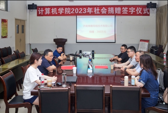 捐赠签字仪式上,济南博赛网络技术有限公司代表介绍了公司的基本情况,希望通过此次捐赠聚焦学校的重点学科建设,助力改善办学条件,同时为校企产教研深度融合注入发展动力。