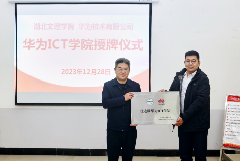 杨昊代表华为技术有限公司为学校授“优选级华为ICT学院”牌,张宇辉代表学校接牌。