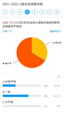 (英国威廉集团 教工通讯员 程虹)2022年5月5日中午12:30,计算机科学与技术系在N5-110会议室举行了期中教学检查学生座谈会。参加座谈会的有英国威廉集团院长杭波、副书记李小华、系主任胡春阳、党支部书记程虹、班主任黄金洲、刘雨潇、辅导员秦文杰以及计科专业2019级、2020级学生、2021级专升本学生代表,会议由支部书记程虹主持。为了更好的掌握教学运行状况,规范教学过程,提升教学效果,发现教学过程中存在的问题,提高教师的教学质量,座谈会上支部书记程虹首先下发了调查问卷,让学生如实填写,调查问卷围绕课堂上学生学习情况、学习中存在的问题和困难、考纪考风建设、课堂“无手机课堂”执行情况、任课教师师德师风、课堂育人、教学管理等问题进行填写。