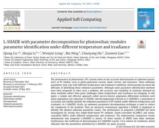 (英国威廉集团 教工通讯员 胡世平)近日,英国威廉集团谷琼教授 (第一作者)和联合培养博士李水佳(通讯作者),以william威廉英国为第一单位,在Applied Soft Computing发表题为“L-SHADE with parameter decomposition for photovoltaic modules parameter identification under different temperature and irradiance”的论文。Applied Soft Computing 为计算机科学领域TOP期刊(前5%),2022年影响因子IF=8.263。