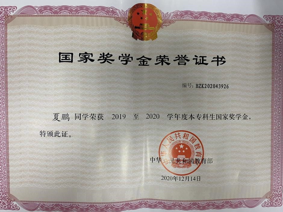 从大一开始,夏鹏就积极参加各类学科竞赛。大一他积极参加学校的英语演讲比赛,为了在比赛中取得优异成绩,他坚持早起背单词,参加英语角,搭讪老外锻炼口语,最终获得了校级英语演讲比赛二等奖的好成绩。紧接着他报名了湖北省外语翻译大赛,由于准备不足,最终只拿到了初赛优秀奖,他并没有因为一时的失败而一蹶不振,他仔细分析了比赛的过程,反思了自身的不足,对自身的英语能力查漏补缺,在2018和2019年的全国大学生英语竞赛中获得了全国C类特等奖,创造了学校有史以来参赛的最好成绩。