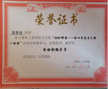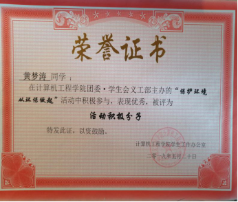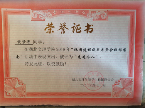 进入大学后,面对他憧憬的大学生活,他加入校社联和院学生会,认识许多优秀的学长学姐,协助组织了许多校园活动,锻炼了他的人际交往和团结协作的能力,其中很多优秀的学长学姐成为他学习的榜样。在学业方面一直保持着刻苦学习、努力钻研的学习态度,认真完成课程任务。空闲时间也会跟室友一同去自习室学习,弥补课堂上未懂的知识。他记得学院李小华老师曾说过:“无论你是谁,每一天都只有24小时。你如何利用时间,决定你会过怎样的人生。”青春就是用来奋斗的,这也是一直激励他砥砺前行的座右铭。