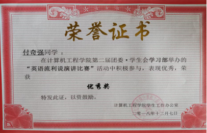 付奇强为人积极向上,活波开朗。大一时加入院学生会新宣部,积极参加学院各种活动并负责为学院拍照撰写通讯稿。在新宣部工作期间锻炼了良好的沟通能力以及团队合作意识。除了正常的学习和生活,付奇强对文体活动也具有浓厚的兴趣,大一至大二期间坚持练习舞蹈并多次在学院元旦晚会和校迎新晚会上表演节目,课余时间还考取了CSDA国家街舞三级教练员。健康有益的兴趣爱好对付奇强来说无疑是生活的助力剂。